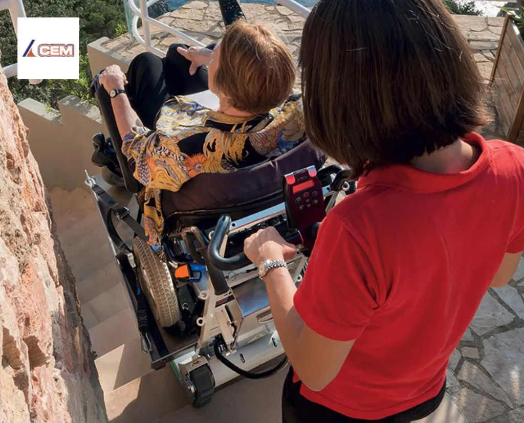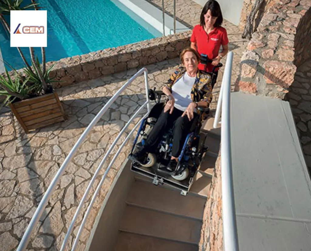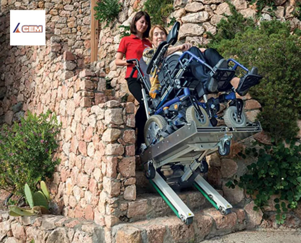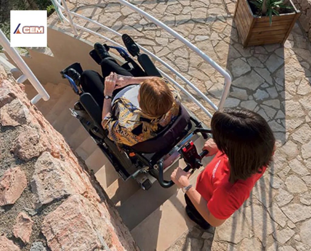 Con la silla salvaescaleras sobre orugas Domino People es posible transitar por diferentes superficies, desde las más delicadas hasta las más rugosas. También es ideal para transportar la silla de ruedas en escaleras exteriores.