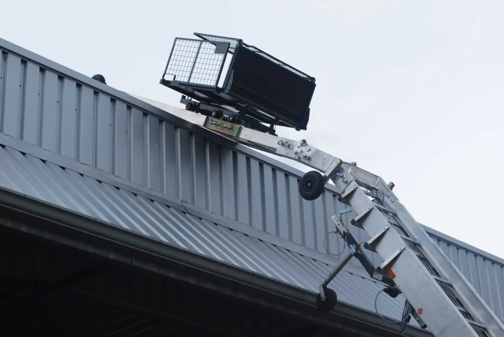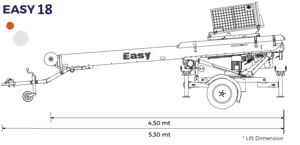 La extensión máxima del elevador son 20 metros, desde la base hasta la punta del elevador en el tejado inclinado, corresponde a 18 metros de altura + 2 metros por encima de un tejado inclinado.