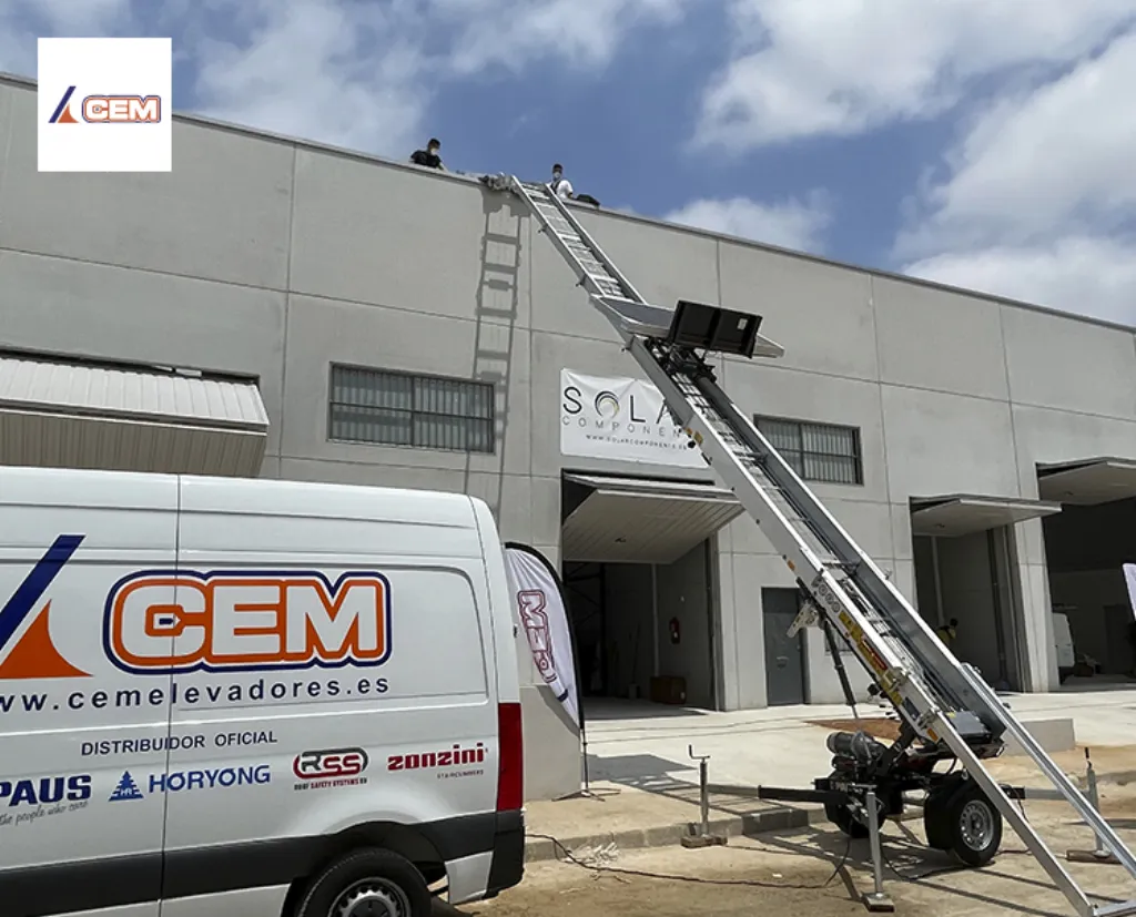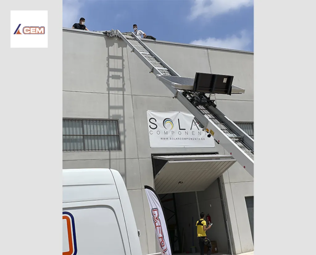 La carga máxima admisible en la plataforma es de hasta 250kg, lo que te permite subir 10 paneles de 25kg/unidad en un mismo viaje, con este sistema de elevacion podrás acortar los plazos de las instalaciones en el sector industrial y evitaras que los chicos instaladores sufran esfuerzos innecesarios.