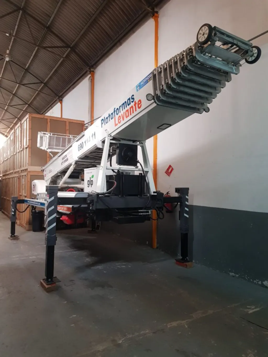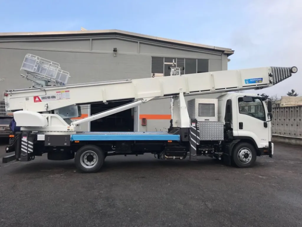 El modelo elegido por Plataformas Levante tiene la novedad de ser la primera grúa de Horyong auto-portante, funciona con varios tipo de motorización, la principal fuente es la toma de fuerza del camión (PTO) la segunda fuente es un motor externo Kubota que alterna los combustibles de gasolina o de GAS (GLP) convirtiéndose en el primer elevador con la etiqueta ecológico.